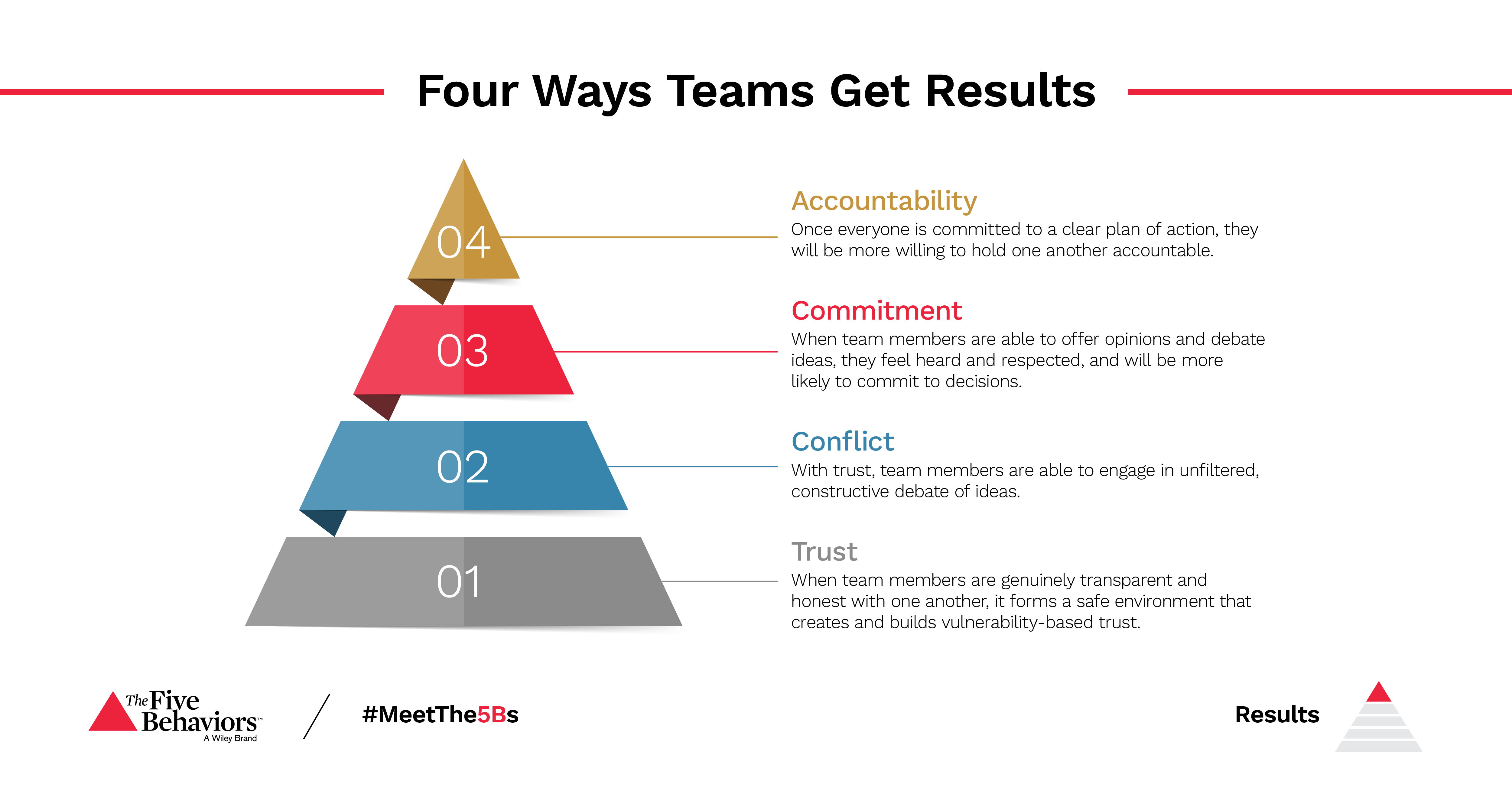 The Five Behaviours are based on an understanding of Trust, Conflict, Commitment, Accountability and Results. This model can be used for specific team development or for broader building a culture of teamwork.